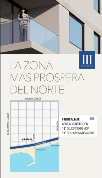 PREVENTA EXCLUSIVA – AURORA DEL MAR III (Entrega 2029) VIVÍ FRENTE AL MAR EN LA ZONA DE MAYOR CRECIMIENTO DE MAR DEL PLATA. Luego del Exito que fue el Aurora I y II se lanza la Preventa del Aurora del Mar III. Aurora del Mar III te ofrece departamentos premium de 4 ambientes. Semipisos de 4 ambientes (100 m2 y 120 m2) Todas las unidades cuentan con vista al mar, parrilla a gas en el balcón, laundry individual en el balcón de contra frente y cochera propia. Piso 4. Disfrutá de amenities pensados para tu bienestar: Piscina símil playa con solárium Gimnasio equipado Spa, sauna y jacuzzi Quinchos para encuentros con amigos y familia Sala de reuniones Únicos Totalmente Financiados en 72 Cuotas sin Interés en Dólares. Financiación única en el mercado. *Todas las unidades poseen cochera* Imagina despertar cada día con el sonido de las olas y una vista inigualable del mar. Contáctanos para coordinar una visita o recibir más información